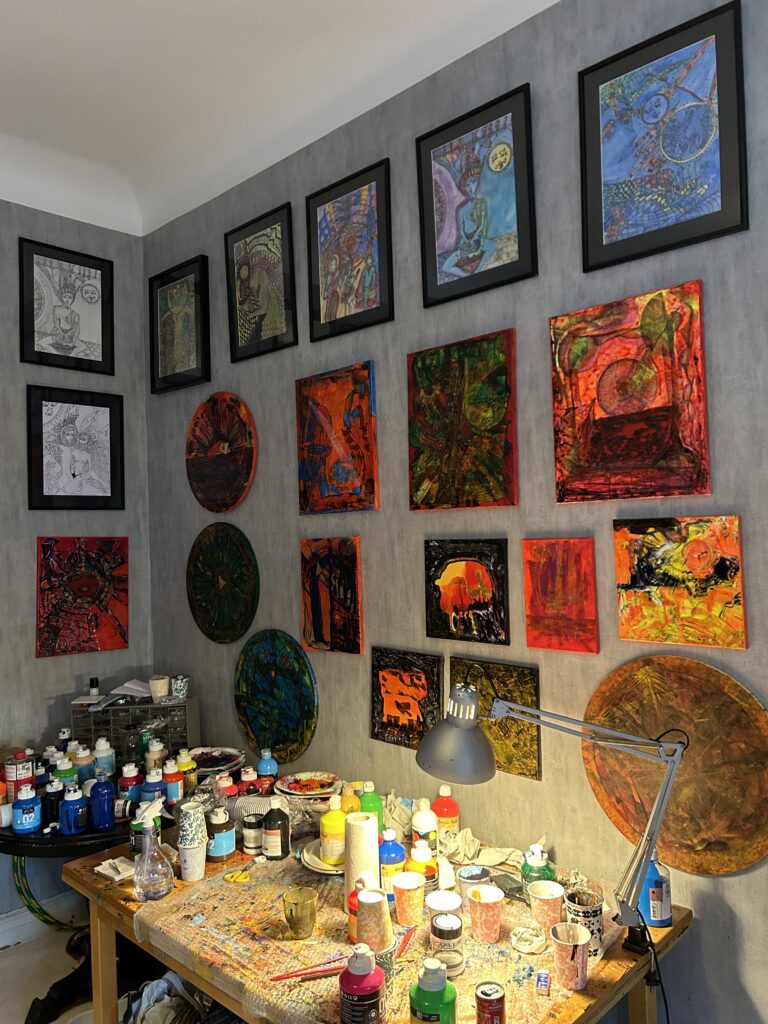 Måla är att skapa. Lyssna andas in titta in i dig själv känn och se med dina Inre ögon, upptäck mera om medvetande inom dig, tänk balansera och harmonisera de nya energierna och frekvenserna som kommer från universum i konsten.